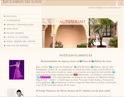 del Cartel La 9a de Andalucia. El proximo dia 18 de Mayo, a las 13:30H, se hara la presentacion del cartel que lleva por nombre "La 9a de Andalucia", del acto que se celebrara mas adelante, el dia 26 del mismo mes, en la pena La Buleria, en Jerez de la Frontera, donde actuara la bailaora Mari Matsumoto "LA CAMPANILLA", estaran como artistas invitados, al cante Melchora Ortega, Miguel Soto "El Londro" y David Lagos. Al baile, Fernando Galan, y a la guitarra Pascual de Lorca. El acto sera presentado por Pepe Marin. 今度の5月18日13時半より 「La 9a de Andalucia」のポスターが発表される。 今月の26日にヘレスのペーニャ・ラ・ブレリアで * Los Caminos del Canteでも紹介されました。